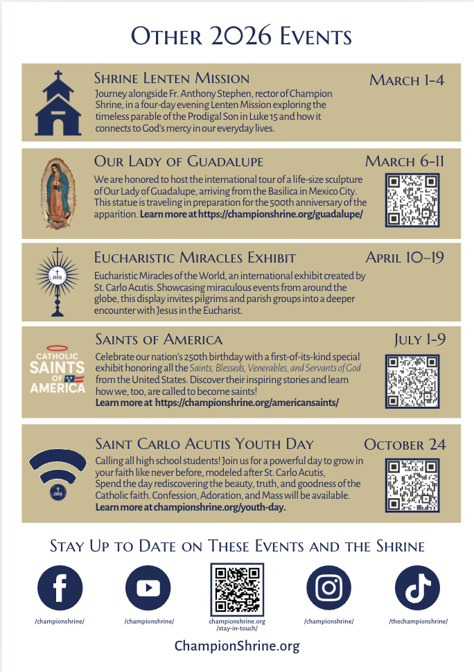 Champion Shrine holds a variety of daily, monthly, and seasonal events to help deepen a pilgrim’s spiritual life. See our upcoming and featured events happening right now and later this year below.