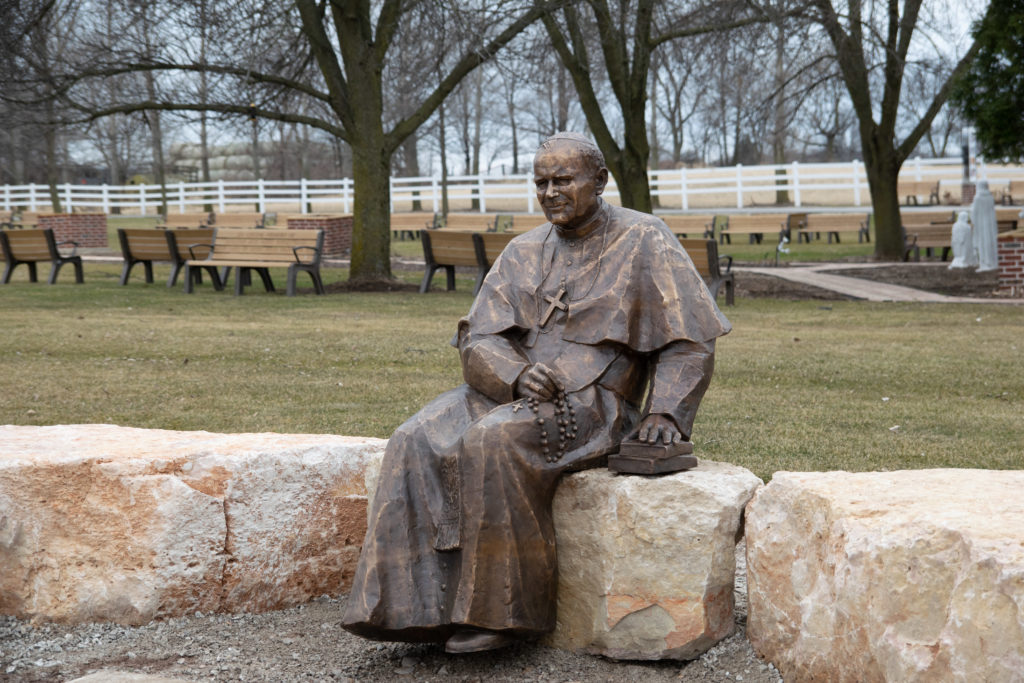 The St. John Paul II Grotto, located on the Rosary Walk, is the Shrine’s newest addition. It allows visitors to sit with a life-sized bronze statue of St. John Paul II to contemplate his devotion to God. This sainted pope dedicated his pontificate to our Blessed Mother, brought the message of Divine Mercy to the entire world, and inspired youth to live for Christ.